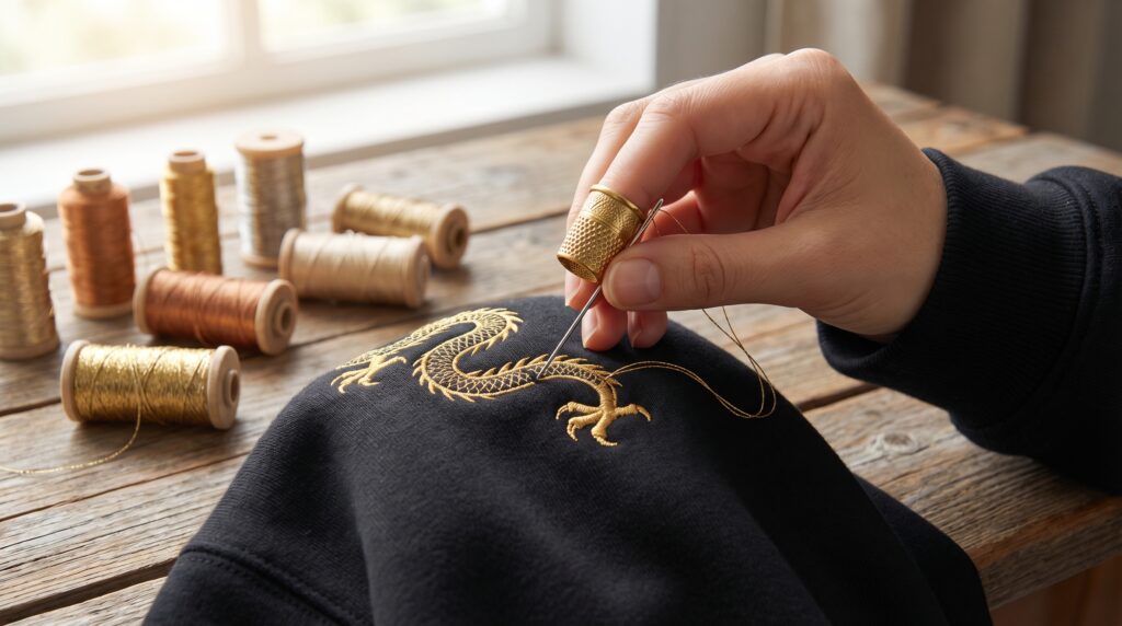 Our embroidery is a marathon of precision. Each piece spends over 18 hours under the needle of a master artisan, utilizing metallic gilded silk threads.